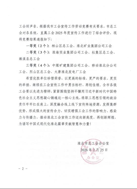 3月3日上午,淮北市總工會(huì)十三屆五次全委(擴(kuò)大)會(huì)議召開(kāi)。會(huì)上通報(bào)了2025年度淮北工會(huì)宣傳工作勞動(dòng)競(jìng)賽結(jié)果,淮海實(shí)業(yè)集團(tuán)工會(huì)獲二等獎(jiǎng)。