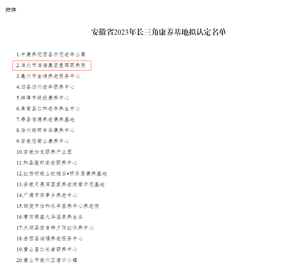 近日,相王現代所屬愛暉頤養院成功被安徽省民政廳認定為“2023年長三角康養基地”。