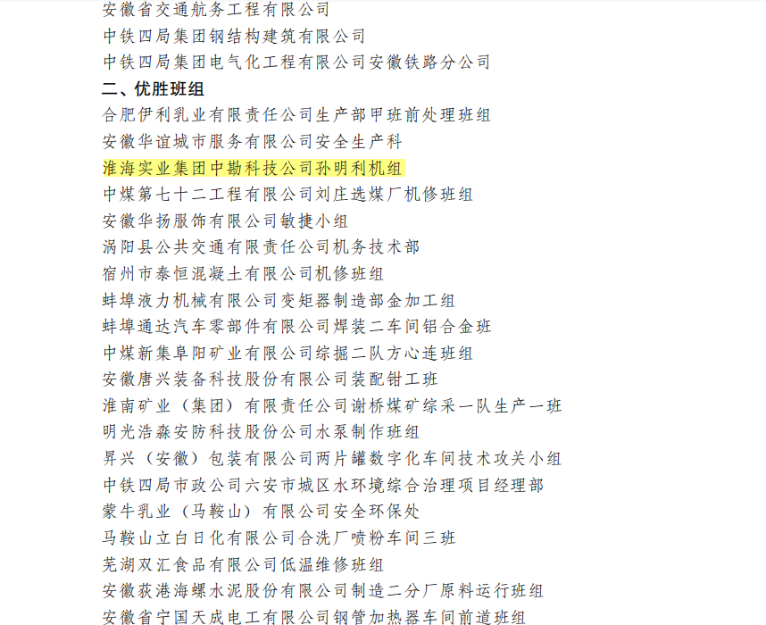 近日,中華全國總工會、應急管理部、國家衛生健康委員會聯合下發表彰決定,淮海實業集團中勘科技公司孫明利機組榮獲2020—2021年度全國“安康杯”競賽優勝班組稱號。