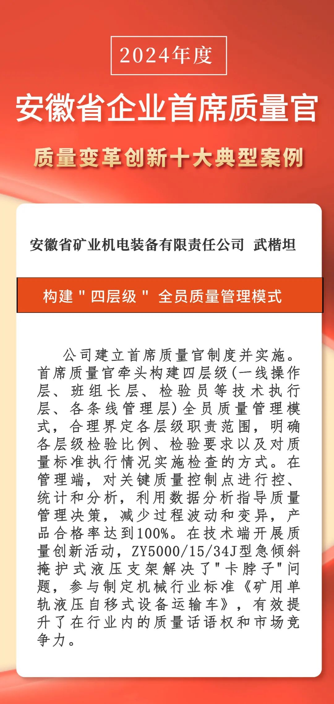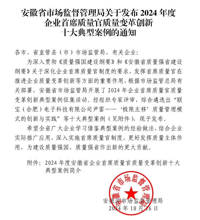 近日,安徽省市場監督管理局發布“2024年度企業首席質量官質量變革創新”十大典型案例,淮海實業集團《“四層級”全員質量管理模式》成功入選。